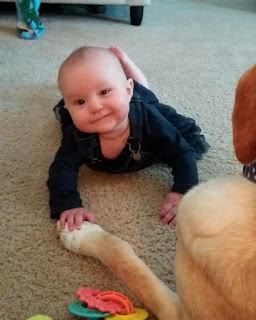 Ellie waved at me one morning. It took me a minute to realize what she was doing and then I realized she was waving and smiling at me and she was working out in her mind how to do it like me! I was ecstatic. Later, she waved at Blondie...who thought Ellie was waving a snack at her. "Lick!" Haha!