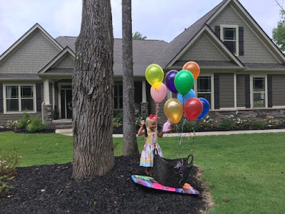 Up, Up, and Awayyyy! We built a hot air balloon! After reading a couple hot air balloon stories, we used the book and blanket basket from our den and tied helium filled balloons to it. I pulled Ellie around in it with the basket sitting on top of her boogie board. Ellie loved this and also pulled her baby dolls around the yard pretending they were flying. When the thrill of the ride "blew away," we took the balloons and painted them with spray bottles full of paint! We got super messy, had a paint war in the yard, and then Ellie just started slapping paint on the balloons all over. Paint everywhere in her hair, on her body, and on the grass! Such a blast! She kept calling it all "my hot air balloon!"