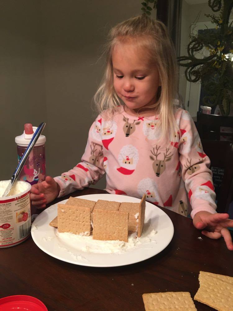 We also used the snowy climate and winter weather to study hibernation. We have been studying hibernation for about a month now but we continued that as part of our study with the book. We built a bear cave in our living room where Ellie and her daddy crawled in to hibernate! Ellie packed some things to make her accommodations satisfactory to her whims and desires. Pillows, blankets, stuffed animals, baby dolls, a flashlight, cup of water, and books later, she was all settled inside her bear cave for a long winter's nap with daddy. The two of them snuggled inside there reading books by flashlight and pretending it was cold if they peeked outside! We also made a bear hibernation snack with graham crackers, teddy grahams, and white icing (snow). I had envisioned a more enclosed structure but part of my job as her mommy teacher is to let her create and explore. Her bear den had walls and a floor. She made pillows and blankets for the bear family out of icing. She gave them beds and designed rooms within her house with her little imagination. She also enjoyed licking her hands clean of any "snow" they happened into. On the hibernation note, she has found it so interesting as again we are just continuing that study, that this week she made her own hibernation burrow outside a couple of times. She dug in our dirt and grass clippings telling me she was using the claws on her paws to dig a warm burrow of which she crawled into like a little animal and pretended to hibernate. Also, on a hike we took this week, we observed under a massive boulder in some sand and dirt what was likely a burrow and hibernation spot for some animal. Beside it, Ellie began digging herself a burrow and said she was going to hibernate with it.