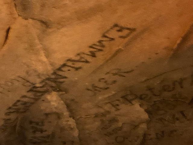 Some of the pictures you will see below show names etched on the cave walls by means of candle smoke. Tours in the cave actually began in the early to mid 1800's after the cave had been pretty well used up for it's gypsum and saltpeter resources. Stephen Bishop was the tour guide in this time and was a black man who was owned by those who ran the cave and sold the tours. Stephen was used to lead the tours and allowed and encouraged in his free time to explore the cave all he desired to find new passageways and anything wonderful to show guests. Some of his tours would take 6+ hours as there was less light, fewer people, and he would grant any request made of him to further explore something a guest pointed out. One thing Stephen did on tours was offer small candlesticks to paying customers of which they would use to write their names dot by dot of black soot onto the walls of the cave. Stephen would sometimes do it for them and they would spell it out for him. This helped him learn to read and spell and write. Stephen was granted his freedom when his owner died as it was written in the man's will. But Stephen Bishop only lived about a year longer and as a free man for he died the next year of complications with a bad tooth which were suspected to now be sepsis. He explored the caves until his dying day even as a free man.