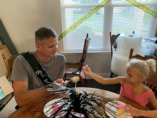 And at home on his birthday we celebrated! We had so much fun decorating the house with all the “over the hill” things, streamers, caution tape, balloons, just all the things. I let Ellie be in charge of the cake. She chose to make Eric a funfetti cake with pink icing and pink sprinkles. π We put 40 candles on it + a 40 and that cake was hot dang it! Eric burned his dang finger twice trying to light that fire hazard! ππ The kids made him cards. We made him a spaghetti dinner and made sure we got all the dishes done for him because usually he does that for me! We love him so much and so honored to be the ones who celebrate him all of his life!