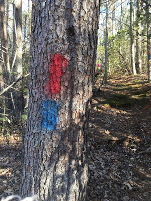 You will start your hike following RED blazes. The blaze colors will change eventually as you progress; I'll tell you when. You start here at the trailhead and soon you will come to the lake which is elevated to the left with an amphitheater. Walk past it and you will see in the woods the blazes continue marked both red and blue and a wooden sign pointing to the "Asbury Trail.". Follow the trail. You again are following the red blazes. Blue just happens to start here too.