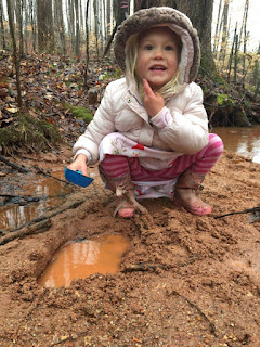 Oh y'all this play dough was awesome! Making your own play dough really is worth the time, not that it takes much time or effort at all. It is soft, it smells better, and it lasts a long time if kept well and is also better on the wallet. We made our own, and we made it textured with coffee grinds which I found really cool considering we were to turn this play dough into worms and worms love to eat our coffee grinds and filters. So, we made the dough, scented with essential oil, dyed brown with food coloring, and textured it with coffee grinds. Then, we rolled it together into different widths and lengths for making our worms. The next step was to play with our play dough worms in a wormy environment that was also stimulating to the senses and the imagination. On a bin lid, I poured and spread cocoa powder for dirt...smelled heavenly....topped the "surface" with grass clippings, and added in our plastic insect toys. Then Ellie got right to making burrows in the "dirt" with the worms, telling stories of the worms and making them speak and play as she played. They ended by all cuddling together as a family down in the dirt. Really really good fun! At the nature park during forest school, I brought worm lures and in nature journals, the girls rolled their worms in mud then rolled and squirmed their worms around on their paper. More textured sensory and artistic play.